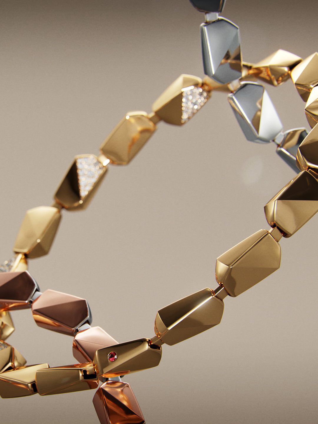 Bricks is characterized by its unique and distinctive shape. Moreover, every piece features the iconic Gübelin ruby. Known as the King of Gems, the ruby is our signature stone and symbolizes the Deeply Inspired philosophy. The iconic ruby marks every jewel and connects you to the House of Gübelin.